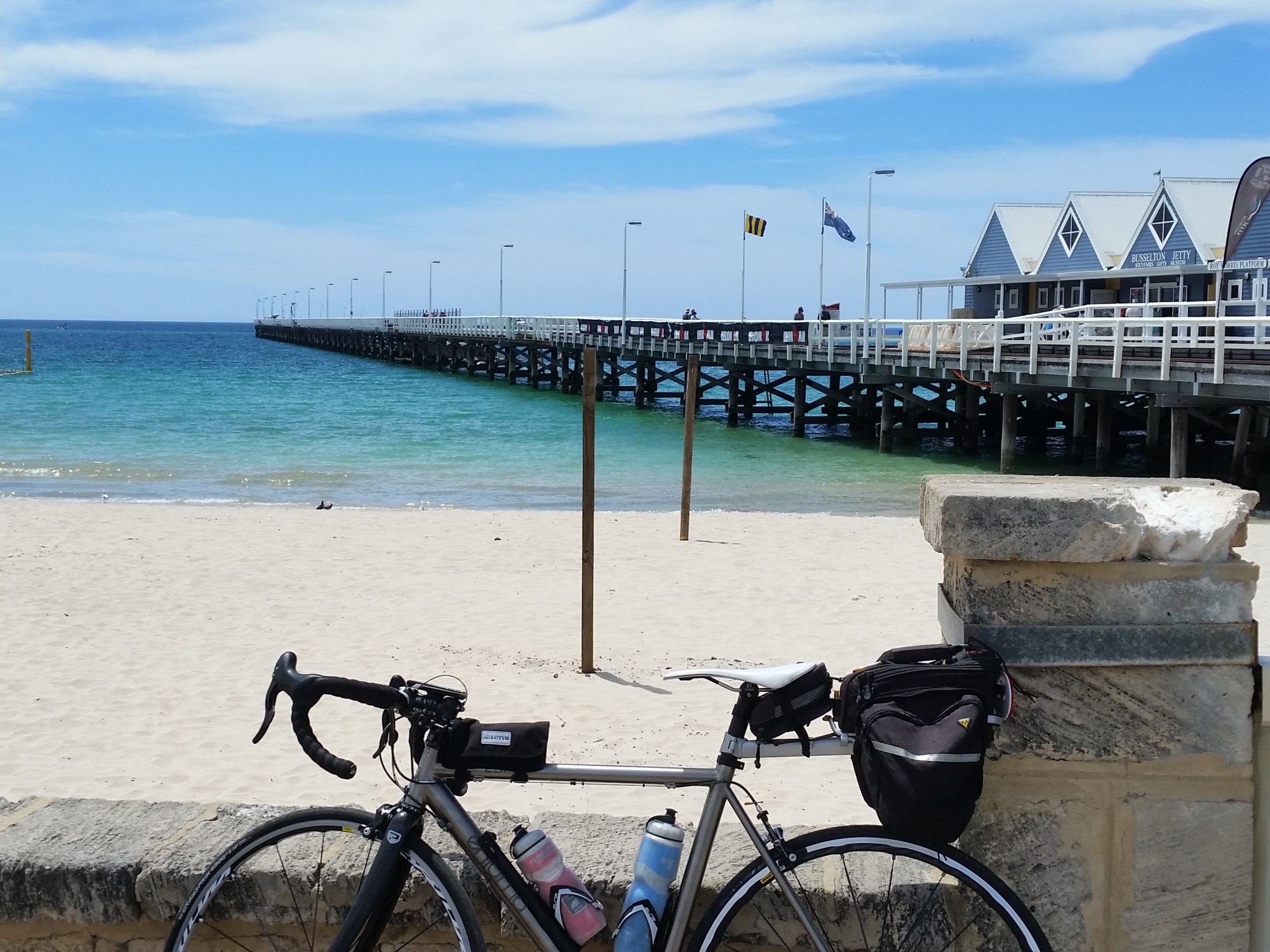 Even though we rose quite early, about 6am, time got away on us and I did not start riding until about 11am, when the day was already warm. The route was very pleasant, mostly following the coast and often on dedicated cycle pathways, however the temperature continued to build. First stop was Busselton where preparations for the Ironman event on Sunday 6 September were well advanced. I had seen quite a few contenders out training in the Ludlow tuart forest on their tri bikes, all looking very serious.